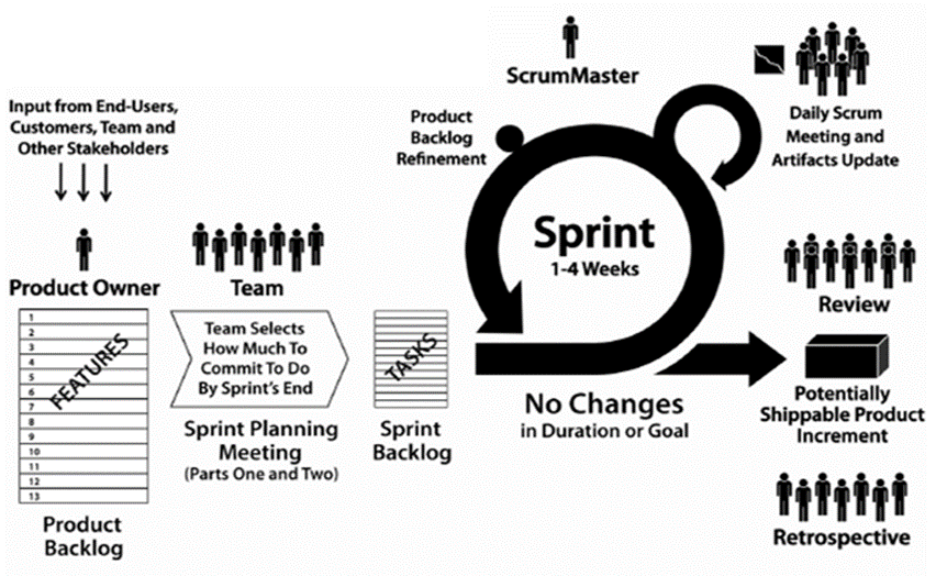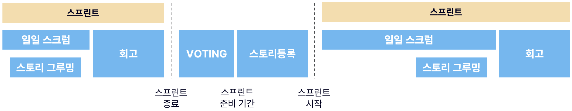 (4주가 제일 적당함, 그 이상은 집중력 저하/버그 수정 때문에 6주까지 가는 경우도 있긴 함/코드 리팩토링이던가 짧게 주기를 가져가서 2주 정도로 돌리는 경우도 있음) - 데일리 스크럼, 리뷰