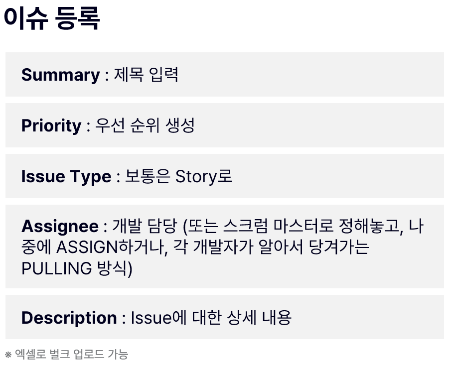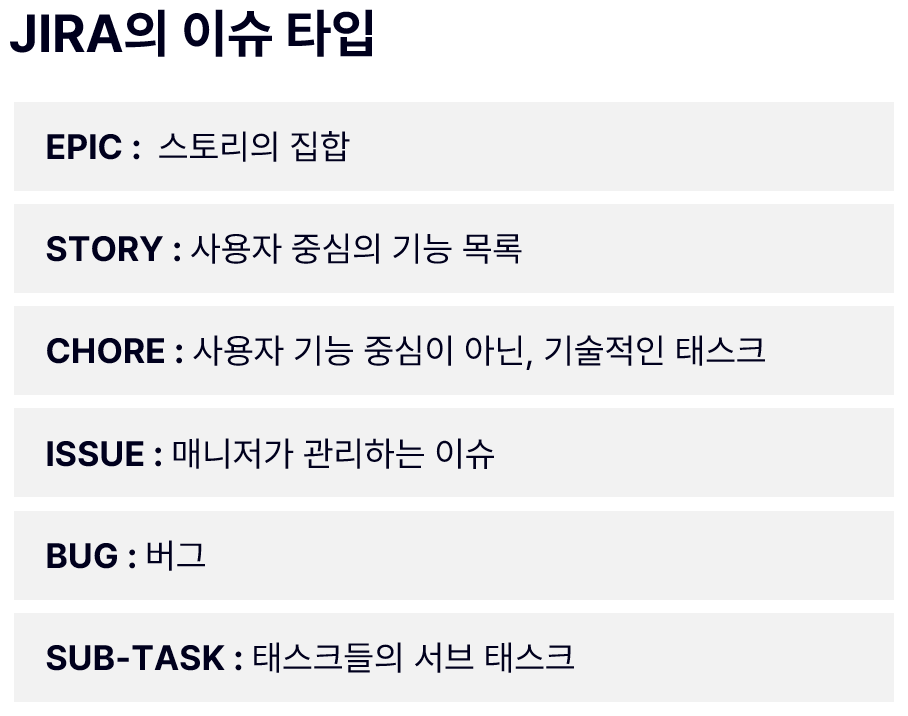 - SUB-TASK는 EPIC, STORY,... 이런게 TASK이고 그 안에 들어감. 예를 들어 ISSUE에 AWS 계약이 아직 안됨이란게 있으면 SUB-TASK로는 AWS 미팅 몇월 몇일, 계약서 작성 몇월 몇일 이런 식이다