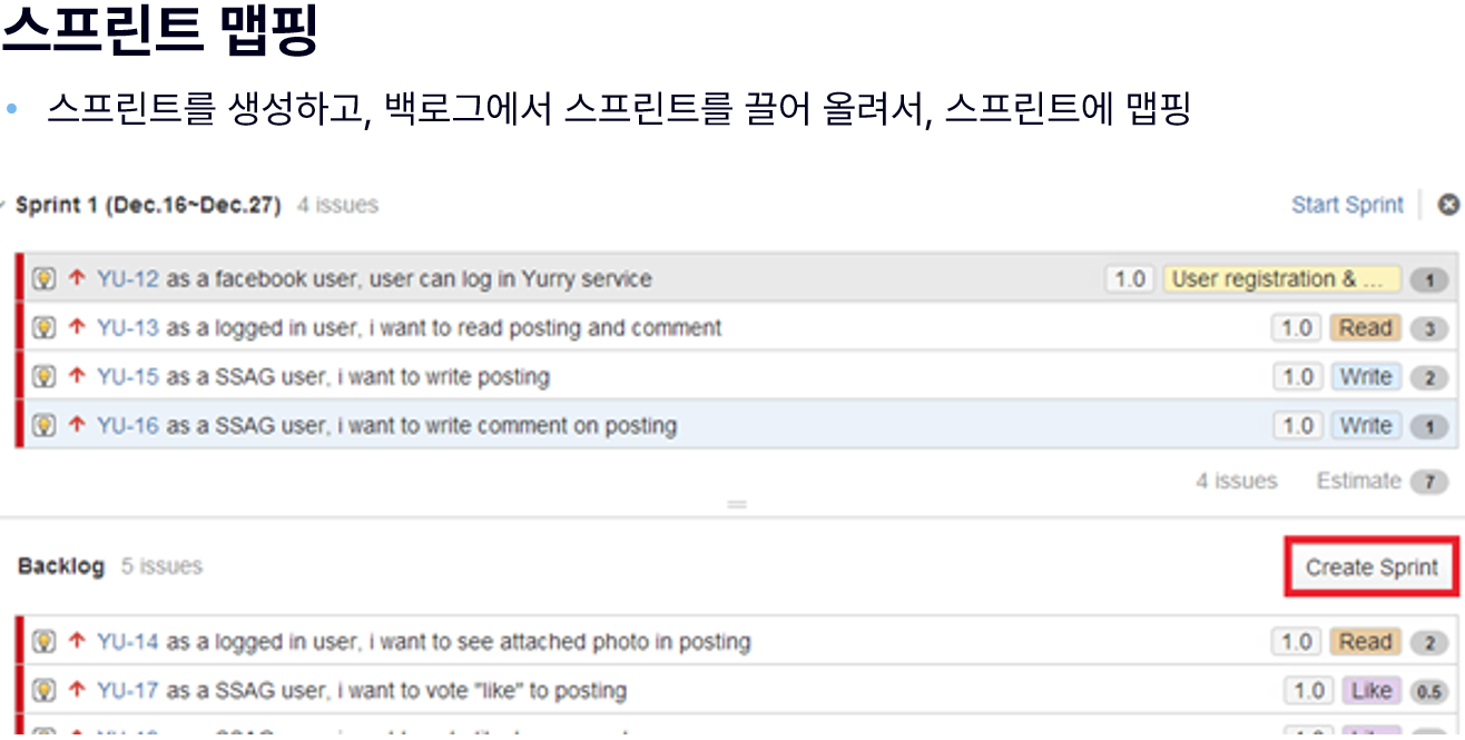 - 백로그에서 개발할 것들을 뽑아서 스프린트 백로그 작성