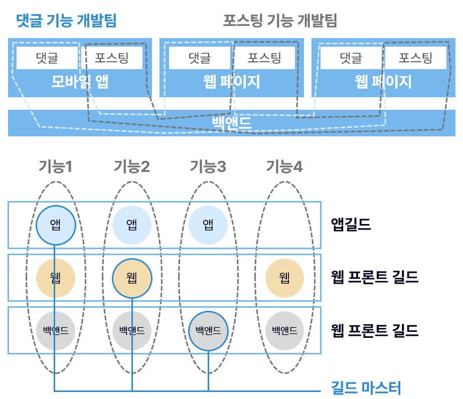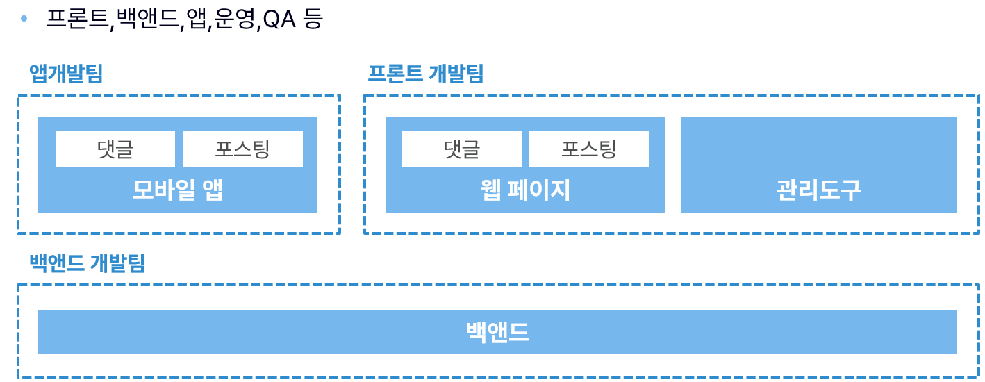 - 기존에는 기술 분류에 따라 팀을 구성하였다 (Functioanl Team)