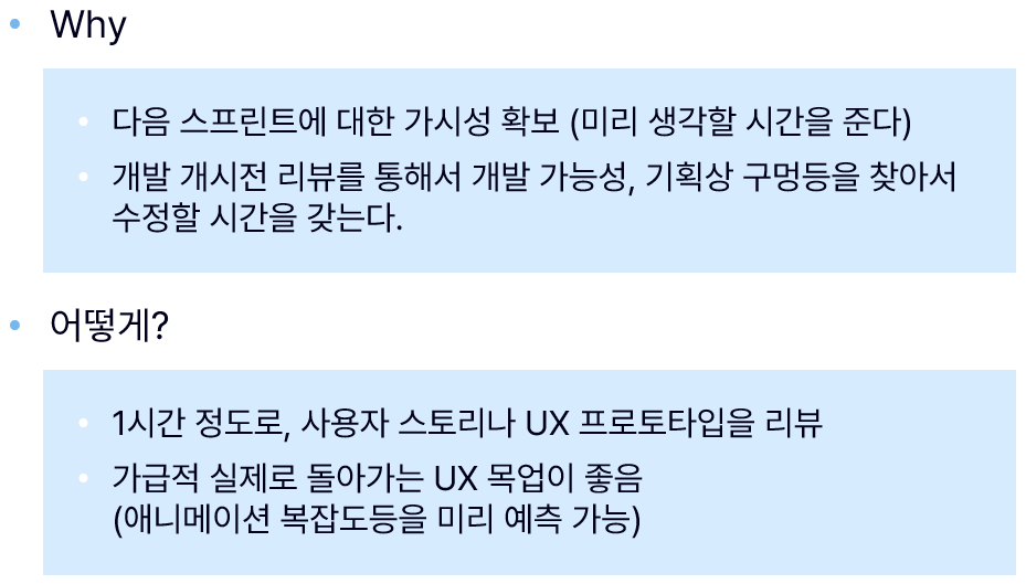 - 스토리 그루밍: 기획, 개발, 아키텍쳐 모두 모여서 다음 스프린트에 들어갈 기능들(백로그)을 하나씩 흐름을 따라가보며 검토하는 것