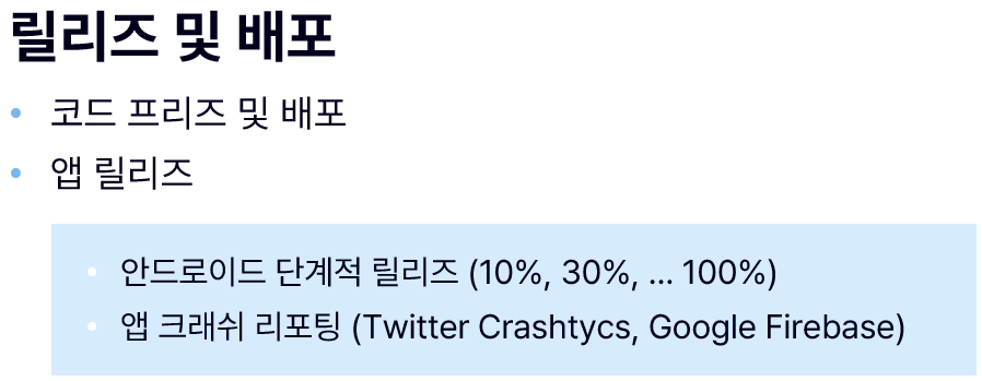 - 릴리즈가 꼭 제품을 출시한다는 의미는 아님. 중간 중간에 동기부여를 위한 마일스톤을 만드는 것의 의미가 더 크다. 사람은 지치기 마련이다