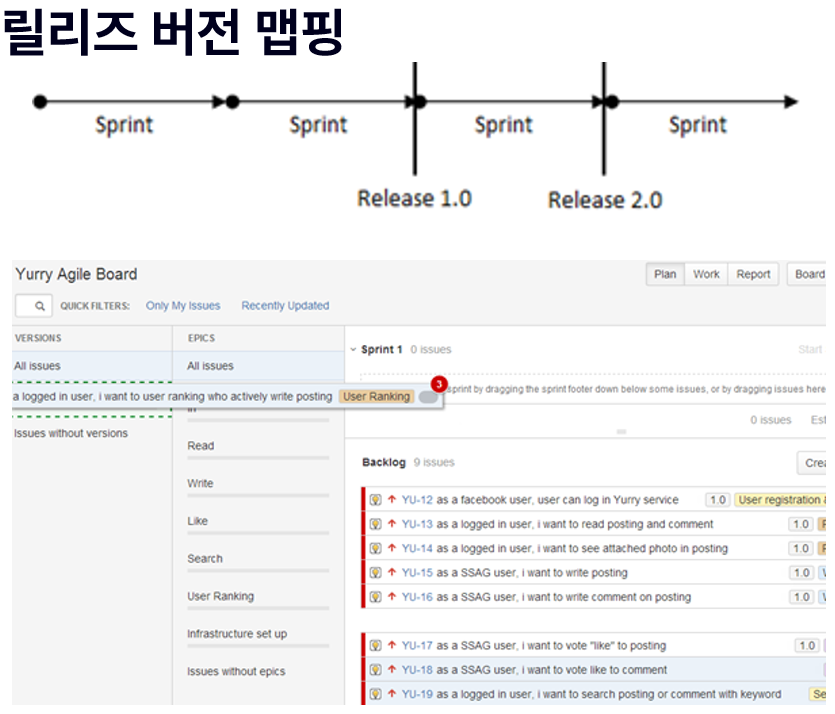 - 릴리즈 버전을 정의해놓고, 버전에 스토리를 맵핑